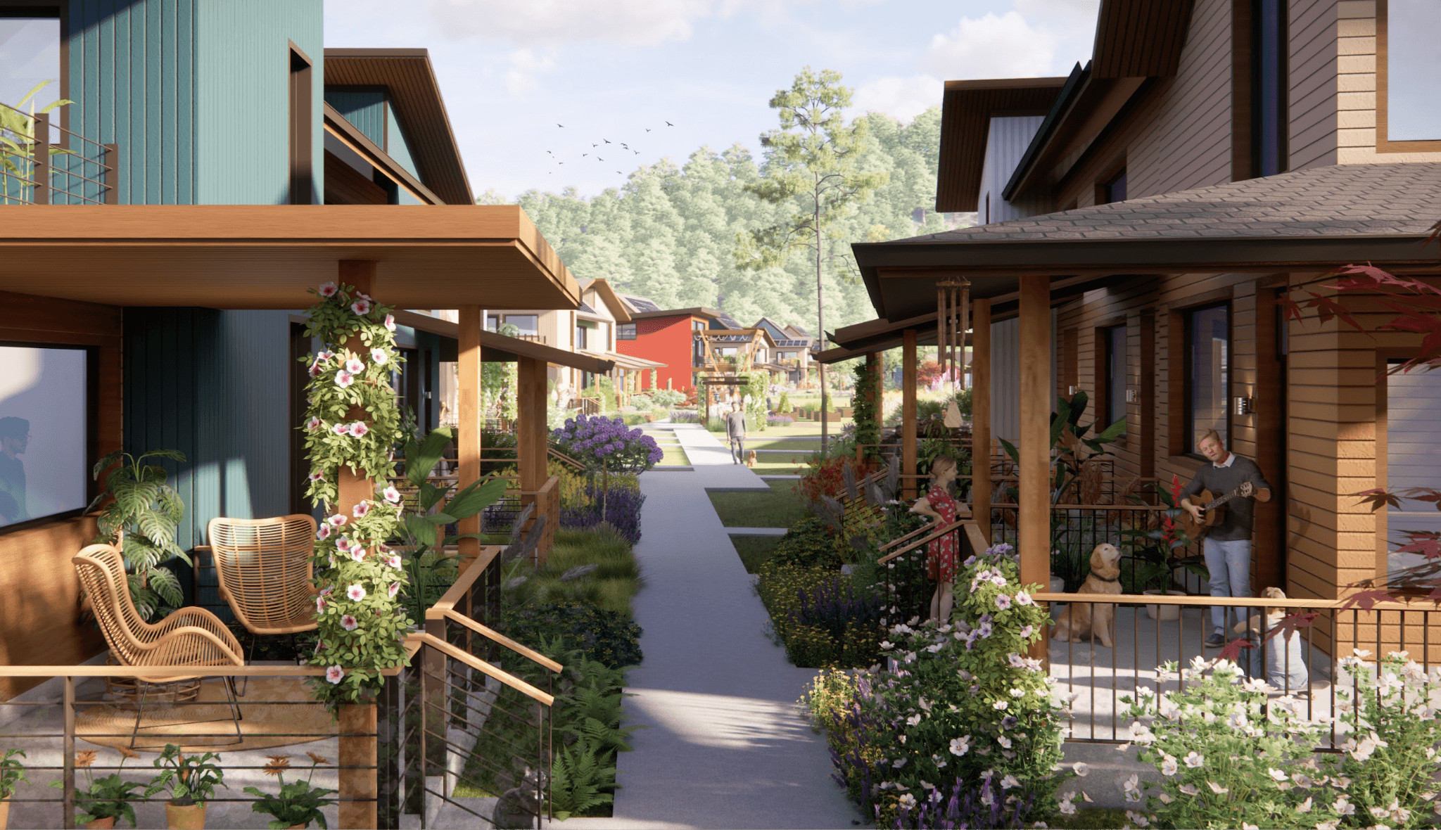 Homes are privately owned and self-contained, while shared spaces are intentionally placed throughout the village so interactions can happen naturally.