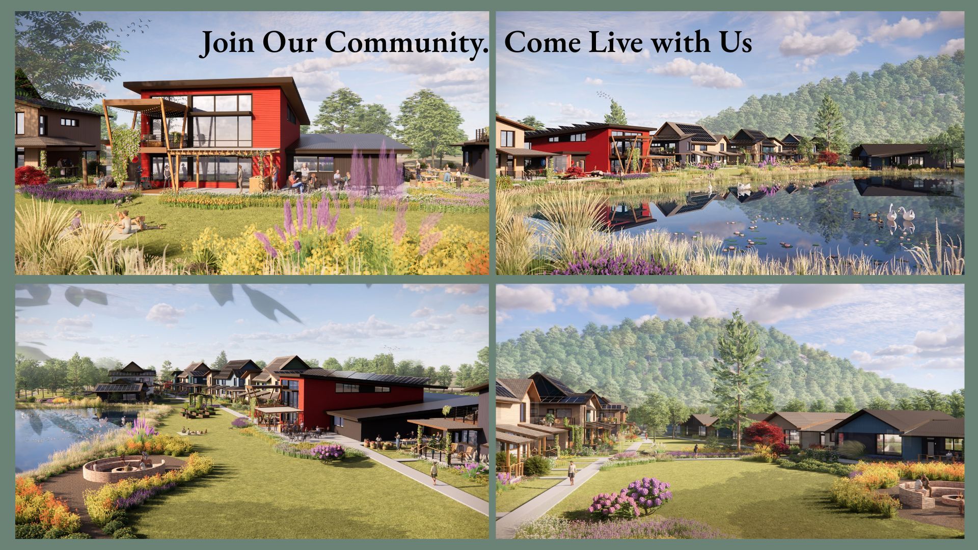 Individual homes built around a community center and common areas encouraging human connection and efficiency.